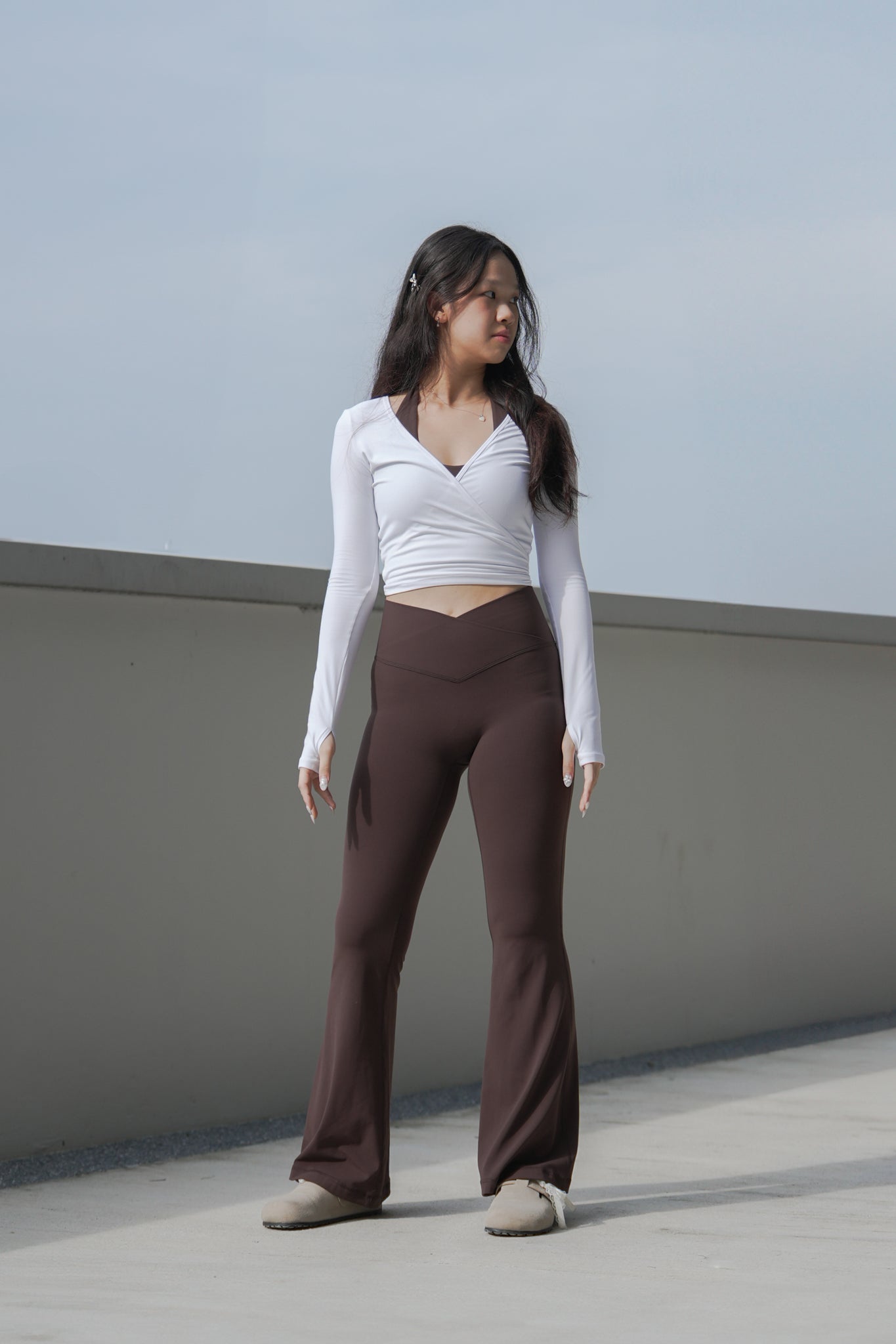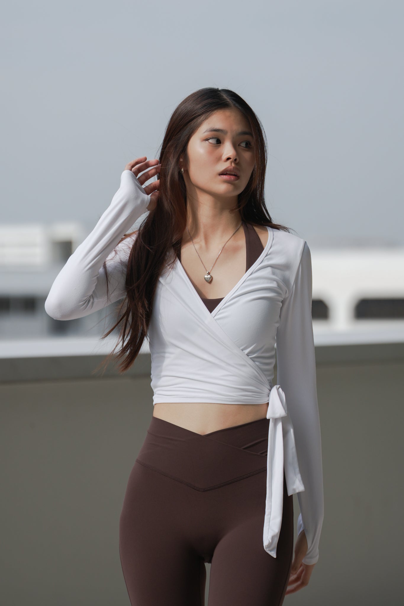 Our ballet wrap top features elegant self-tie ribbons for a customizable fit and subtle thumb holes for added comfort. Effortlessly versatile, it’s perfect for layering or wearing on its own.